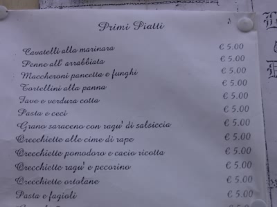 Je n’ai pas résisté à photographier cette partie du menu. Cela donne une idée des pâtes servies en « primi ». Les « primi » se composent soit de pâtes, soit de potages. Je donnerai dans les jours qui viennent les recettes de ces différents plats de pâtes de la cuisine italienne des Pouilles. Remarquez à droite les prix. La photo date de décembre 2006. Cela a surement augmenté depuis, mais c’est encore abordable. Ce ne sont que des pâtes et des légumes après tout !
